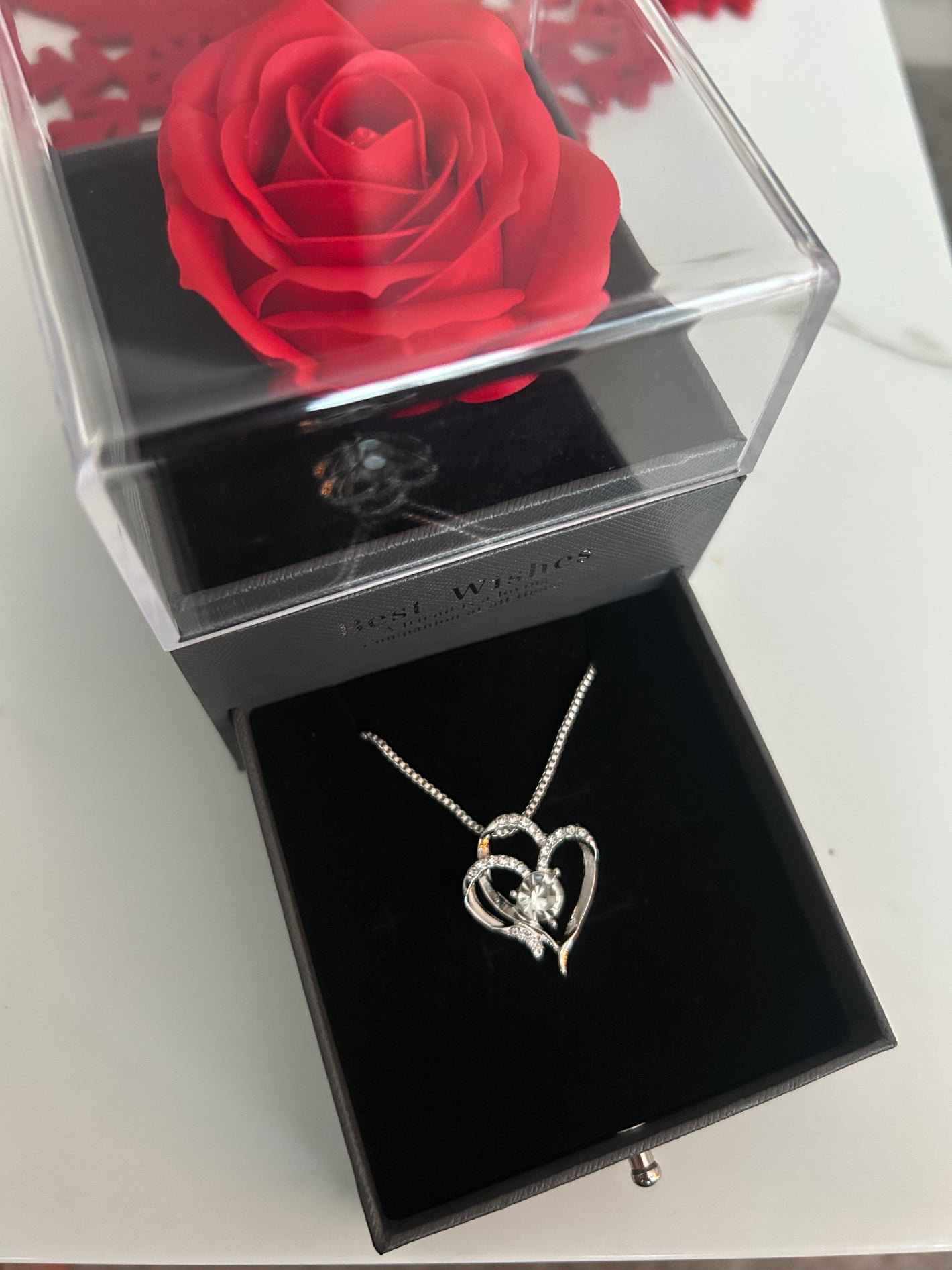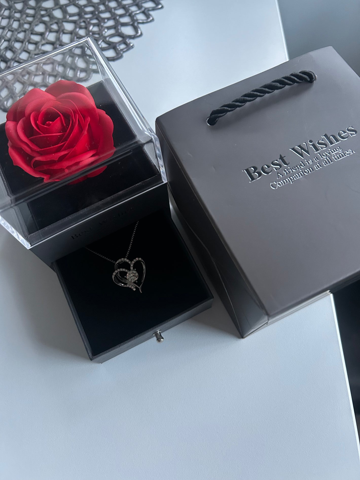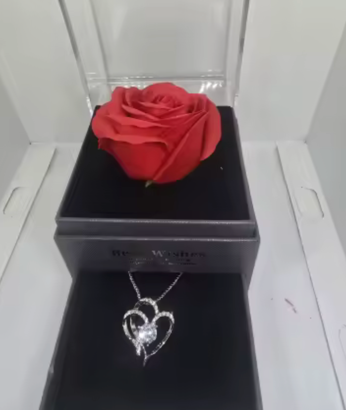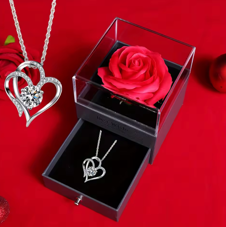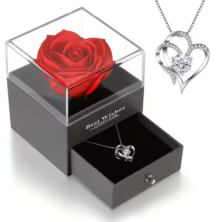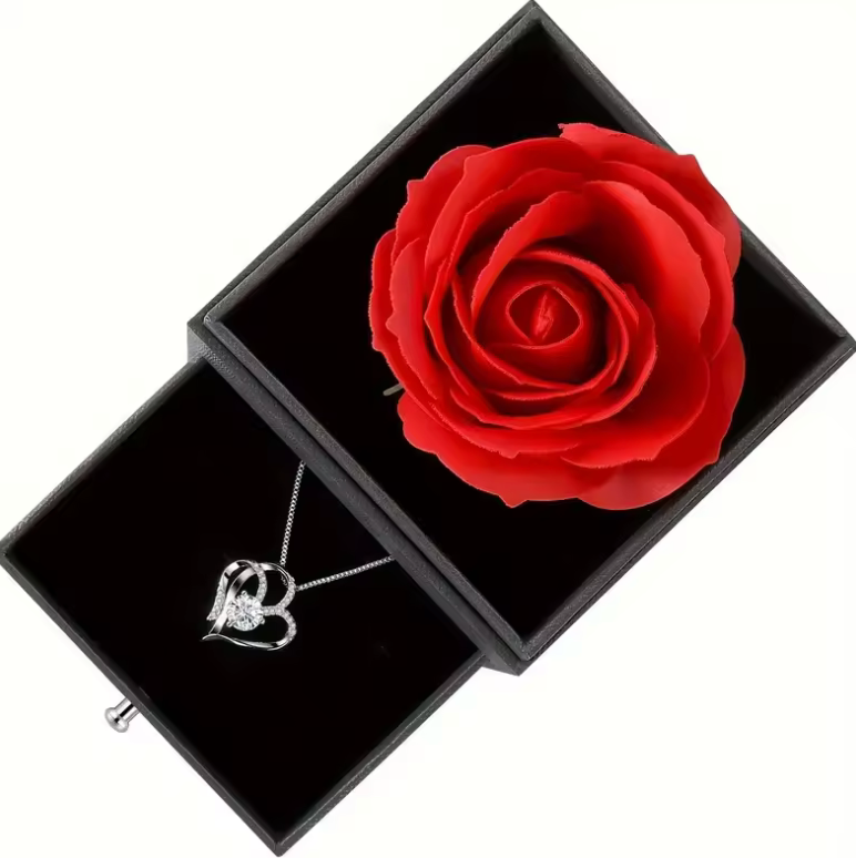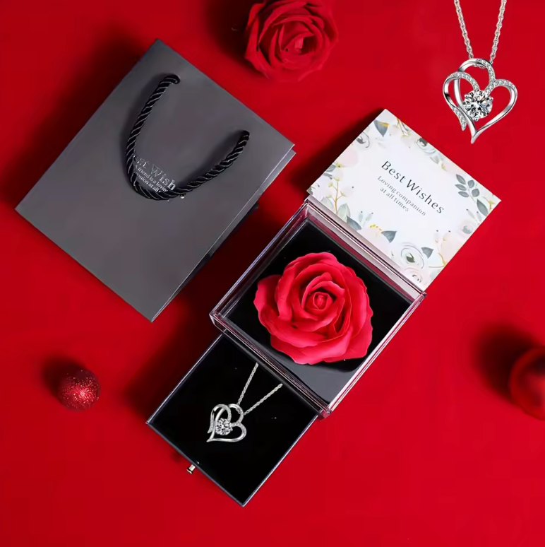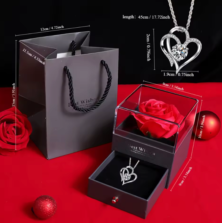 Podaruj coś więcej niż zwykły upominek. Ten wyjątkowy zestaw łączy elegancki naszyjnik w kształcie serca z luksusowym pudełkiem i czerwoną różą, tworząc prezent, który wywołuje prawdziwe emocje.